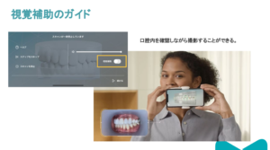視覚補助をONにすると、ご自身の口腔内が映し出され確認しながら撮影できます。